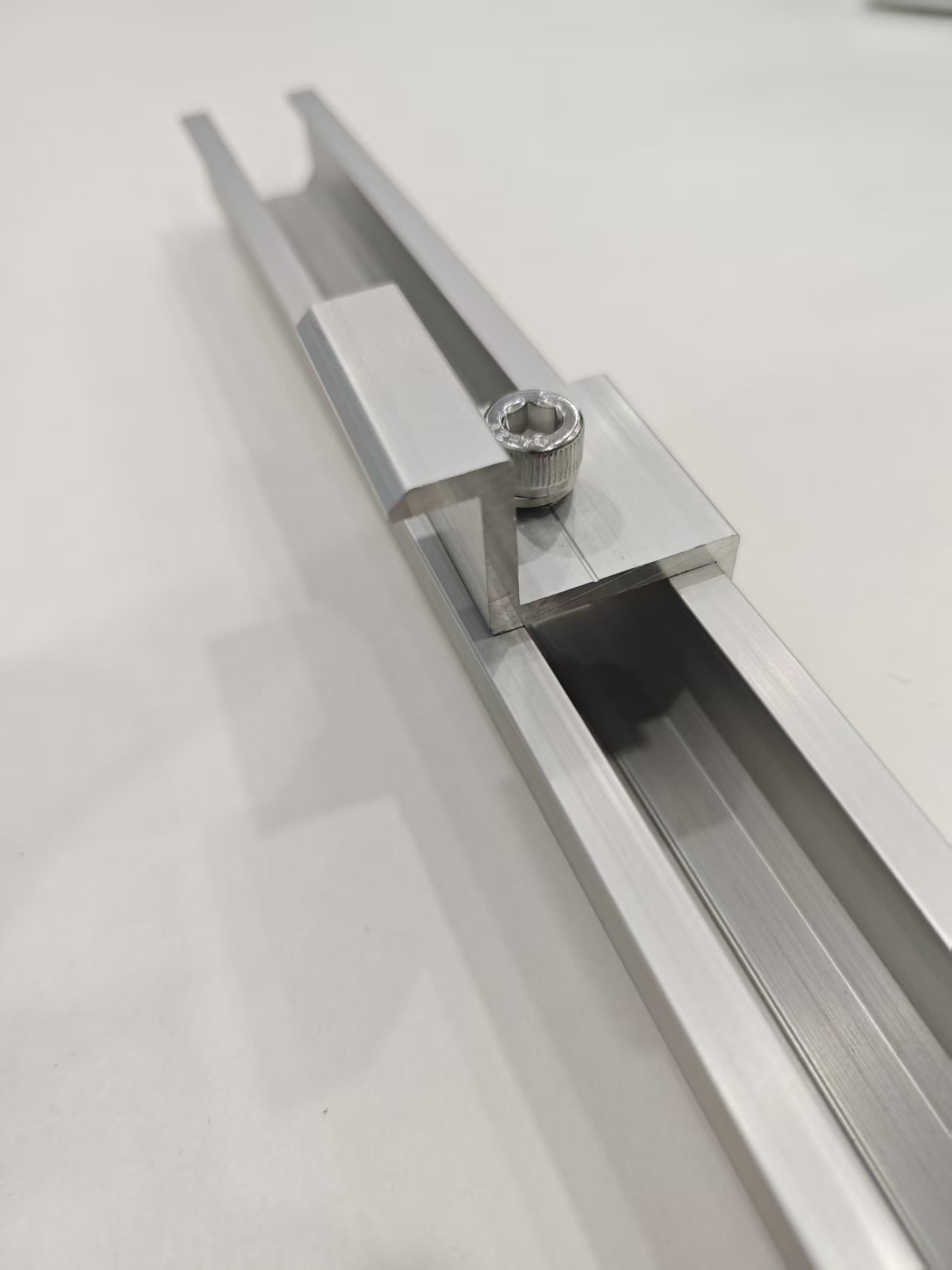 3. তারপর ট্র্যাকের মধ্যে সেন্টার এন্ড ক্ল্যাম্প এবং মিড ক্ল্যাম্প ঢোকান এবং বোল্টগুলিকে শক্ত করুন। এই প্রক্রিয়া চলাকালীন, ফটোভোলটাইক প্যানেল একযোগে স্থাপন করা আবশ্যক।